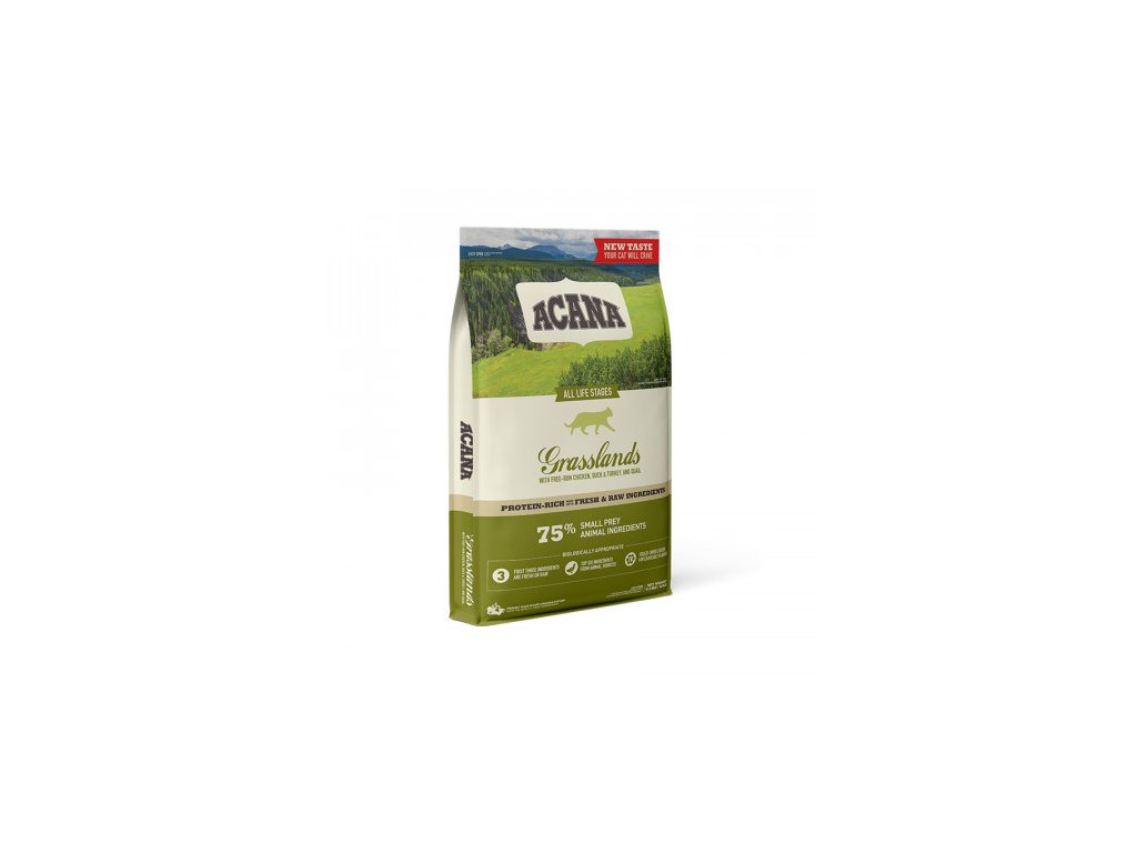 ACANA GRASSLANDS CAT GRAIN-FREE je kompletné krmivo pre dospelé mačky všetkých plemien. Obsahuje mäso z voľne lovených rýb- sleď, makrela, treska, hejk, platesa. Kvalitné živočíšne proteíny a omega 3 prispievajú k výbornej kondícii mačky. 75 % MASA | 1/2 ČERSTVÁ