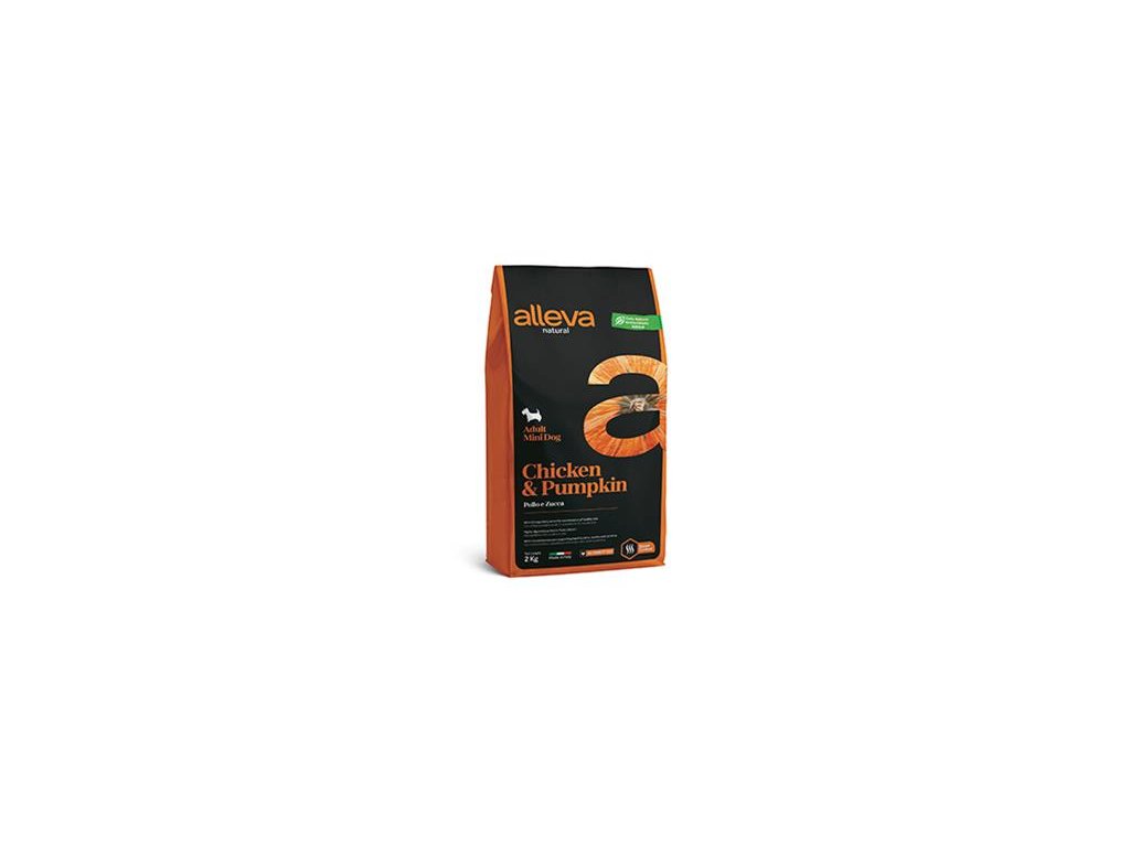 Alleva Natural Dog adult mini chicken & pumpkin je kompletné suché krmivo pre dospelých psov malých plemien. Krmivo je s nízkym obsahom obilnín pre šetrnejšie trávenie. Čerstvé mäso, hnedá ryža a sušená tekvica poskytujú perfektne vyváženú stravu pre tých, ktorí dbajú na kvalitu ingrediencií. Vybrané výživné a vysoko kvalitné ingrediencie sú pripravené zaparovaním , aby si zachovali chutnosť a živiny. Sušená tekvica sa používa ako zdroj ľahko stráviteľnej vlákniny pre šetrnejšie trávenie.