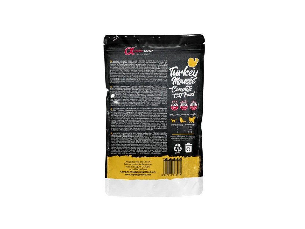 Alpha Spirit Cat Adult - Turkey with Pear je kompletné krmivo od španielskeho výrobcu Alpha Spirit s 93% podielom mäsových častí z voľne chovaných...