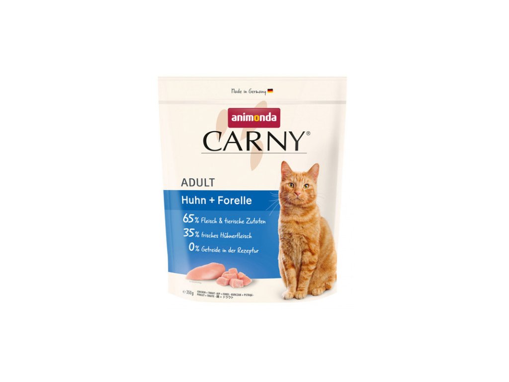Animonda Carny Adult Grain Free - Chicken + Trout je kompletné bezobilninové krmivo pre dospelé mačky s vysokým obsahom čerstvého mäsa. S obsahom 65% živočíšnej zložky.Neodolateľne chutné a chrumkavé granule...