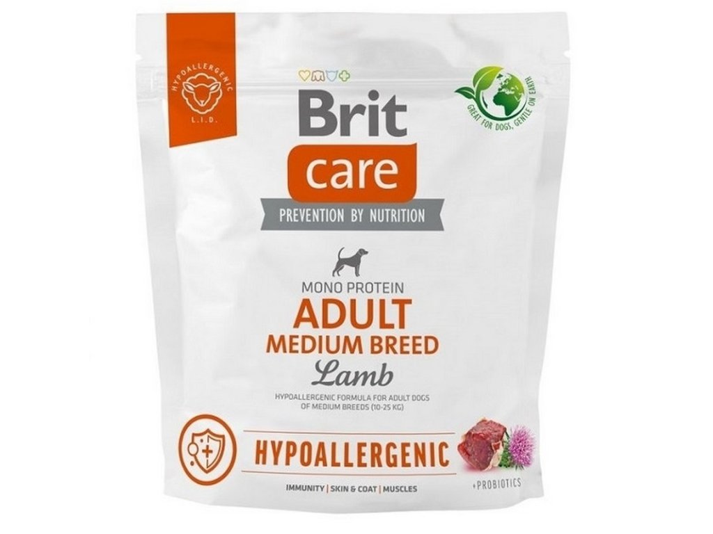 Superprémiové Brit Care Dog Hypoallergenic adult medium lamb krmivo obsahuje jediný zdroj živočíšnych bielkovín a to jahňacie mäso. Podporuje prevenciu alergických reakcií na potraviny. Zloženie je vhodné pre psy, ktoré nereagujú dobre na bielkovinové krmivá, a psy s alergiami alebo citlivým trávením. Granule sú vďaka svojej veľkosti vhodné pre všetky dospelé psy stredných plemien s váhou do 25kg. Granule majú optimálne zloženie vďaka obsahu probiotík, chondroprotektív a ostropestreca mariánskeho.