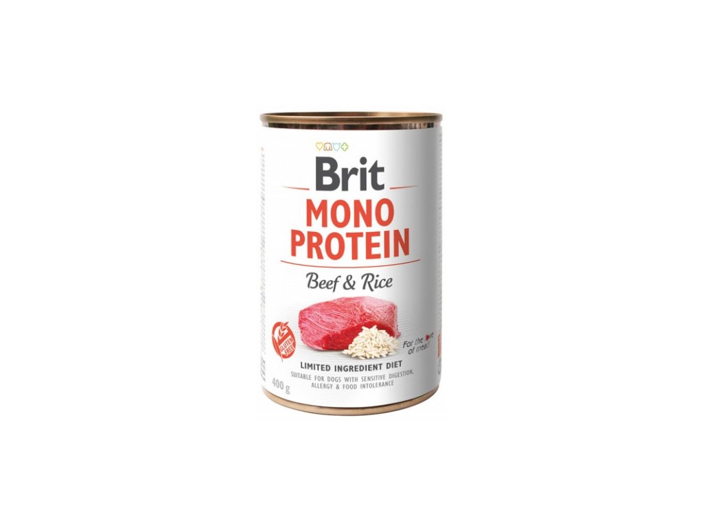Brit Mono Protein Beef & Rice 400 g je kvalitná konzerva pre psy s hovädzím mäsom a ryžou. Konzerva obsahuje len jeden druh proteínu a preto je vhodná aj pre psy s alergiou, alebo citlivým trávením.