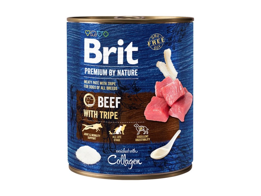 Brit Premium by Nature Beef with Tripes je mäsová konzerva pre psov s kolagénom. Lahodná kombinácia mäsových kúskov a orgánového mäsa vo forme paté (paštéta) dokonale uspokojí aj tých najvyberavejších psích gurmánov a prispieva k dobrej stráviteľnosti. Konzerva je ideálnym doplnkom alebo spestrením ku granulám. Pomáha zlepšiť príjem krmiva a doplniť tekutiny. Obohatené o čučoriedky pre podporu imunity, lososový olej, ovocie a byliny.