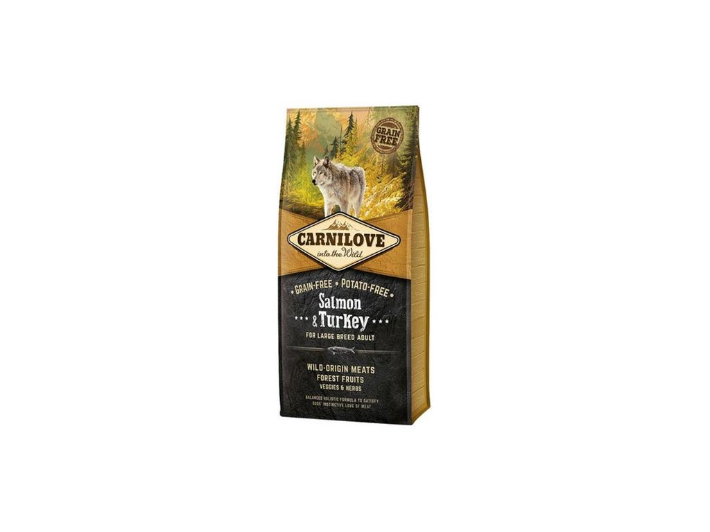 Carnilove je najvyšší rad krmív českej značky Brit. Carnilove Dog Salmon & Turkey for Large Breed Adult je krmivo bez obsahu obilnín a zemiakov pre dospelých psov veľkých plemien. Celých 45 % zloženia tvorí múčka z lososov a morčacieho mäsa. Sacharidy sú zastúpené predovšetkým žltým hrachom, tapiokou, jablkami a cícerom. Losos je zdrojom vysoko stráviteľných proteínov. Je bohatým zdrojom omega-3 nenasýtených mastných kyselín, ktoré pozitívne ovplyvňujú mentálny vývoj, kardio-vaskulárnu sústavu a metabolizmus (znižujú obsah krvného cukru). Losos má pozitívny vplyv na kvalitu a vzhľad srsti a kože. Moriak je bohatým zdrojom stráviteľných proteínov s vysokým obsahom stopových prvkov, hlavne zinku. Obsahuje tiež vitamíny B3 a B6, ktoré ovplyvňujú činnosť mozgu, svalový tonus a sú nevyhnutné pre zdravý rast.