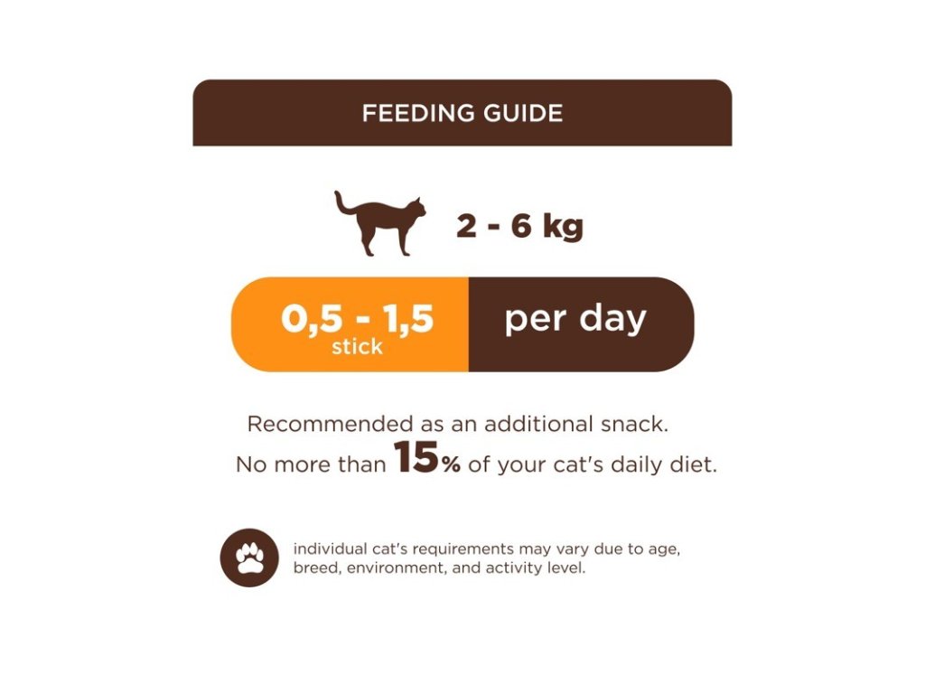 Kŕmny návod: Hmotnosť dospelej mačky, kg / Tyčinky za deň, ks: 2-6 / 0,5-1,5.