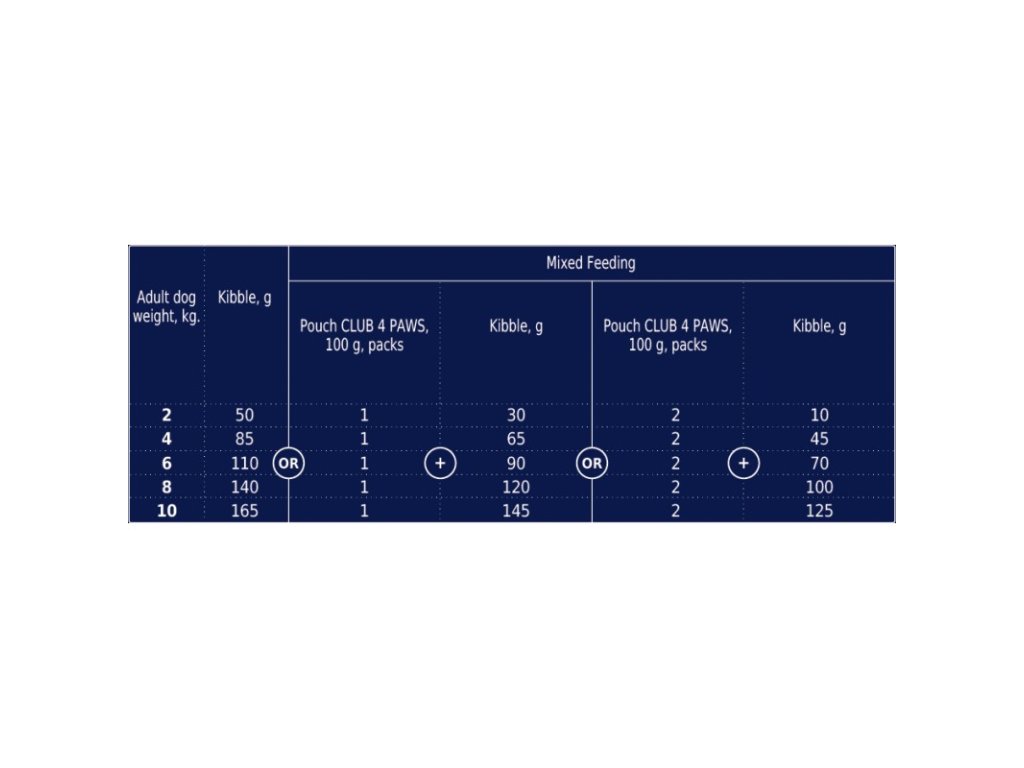 Energetická hodnota (kalorická hodnota): 1 586,87 kJ (379,27 kcal). Skladovať v chladnom, suchom a nie slnečnom mieste. Krmivo je nutné zavádzať do stravovania postupne (aspoň počas prvých 5 dní). Zabezpečte zvierati stály prístup k čistej a sviežej vode. Individuálne normy krmenia môžu sa meniť v závislosti od veku, druhu, úrovni aktivity a prostredia pobytu zvieraťa. Odporúčané dávkovanie krmiva: je ukázaný v tabuľke kŕmenia. Kombinujte krmenie s krmivom CLUB 4 PAWS Premium S kuracím mäsom v želé. Plnohodnotné konzervované krmivo pre dospelé psy. Dátum výroby, dátum použiť do, číslo partie sú ukazané na balení.