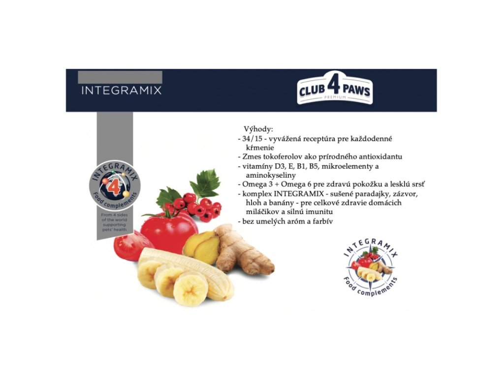 - Vzorec INTEGRAMIX: sušené paradajky, zázvor, hloh a banány - pre celkové zdravie domácich miláčikov a silnú imunitu