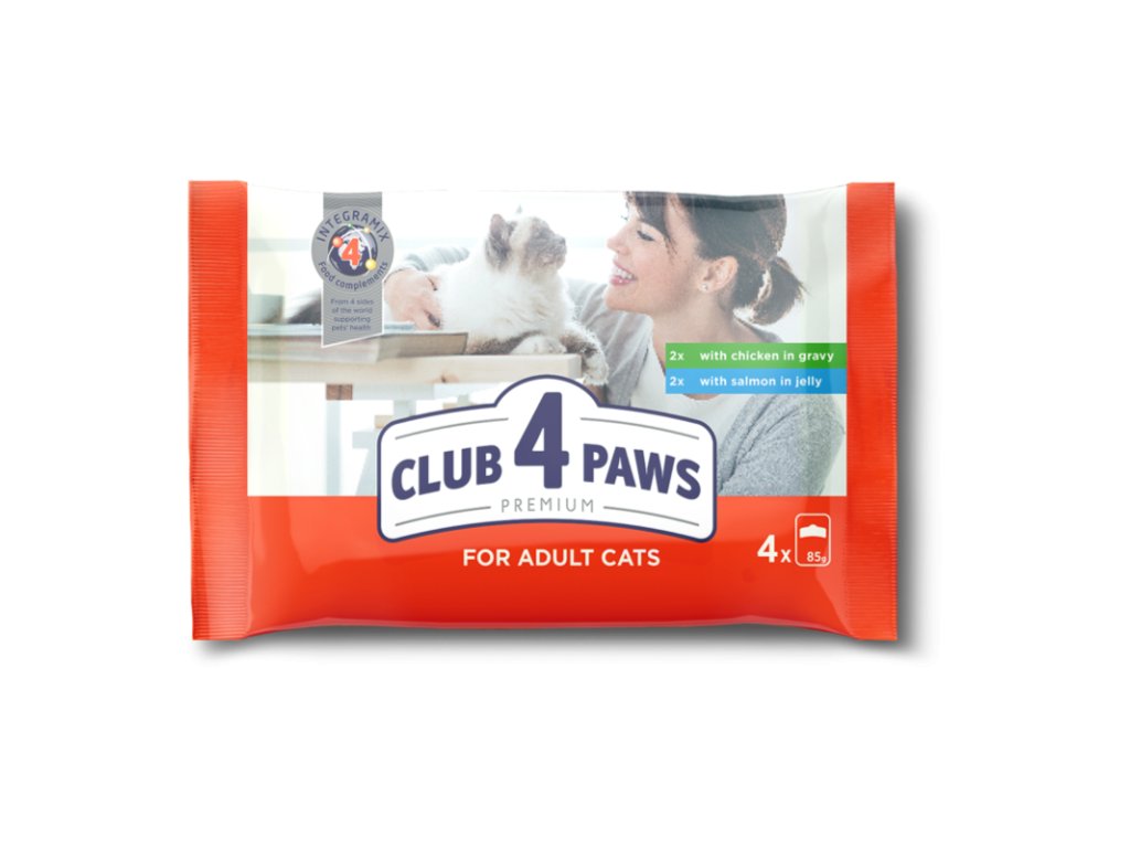 CLUB 4 PAWS Premium SET Pre dospelé mačky S kuracím mäsom v omáčke, S lososom v želé 4x80g (9060)