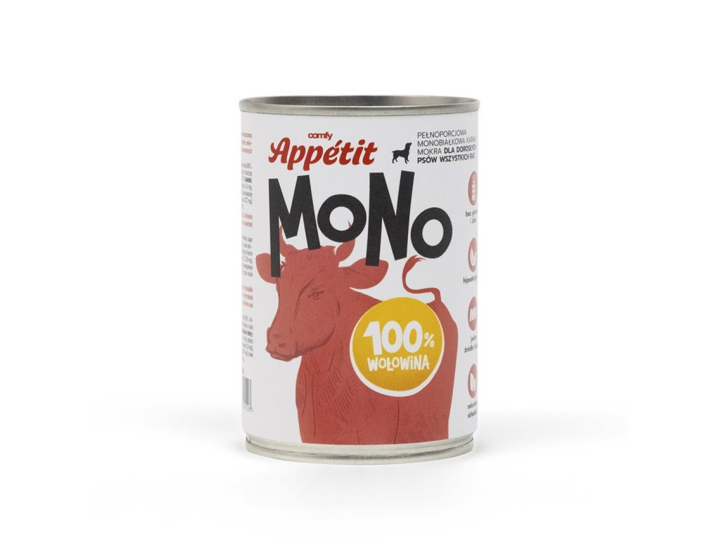 Comfy Appetit MONO je kompletné jednobielkovinové vlhké krmivo s hovädzím mäsom pre dospelé psy, vyrobené z prírodných surovín. Príchuť 100% hovädzie mäso. Krmivo obsahuje 96 % mäsa a vnútorností, zvyšné 4 % tvoria vitamíny a minerálne látky.