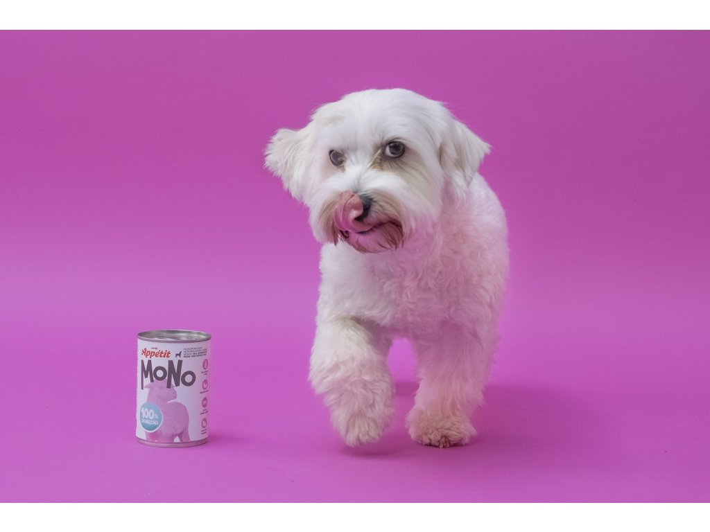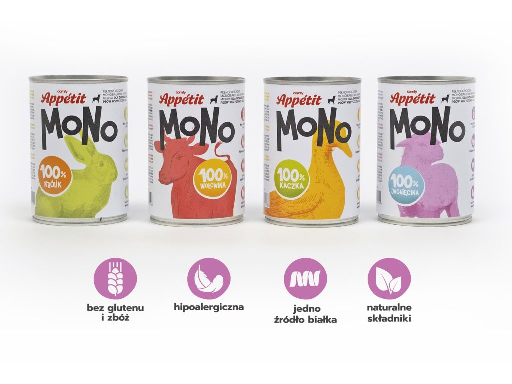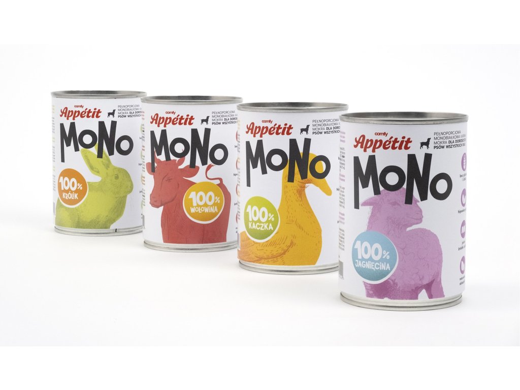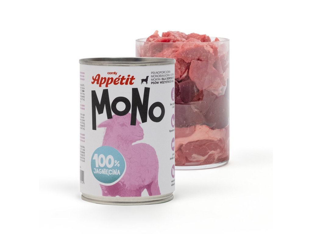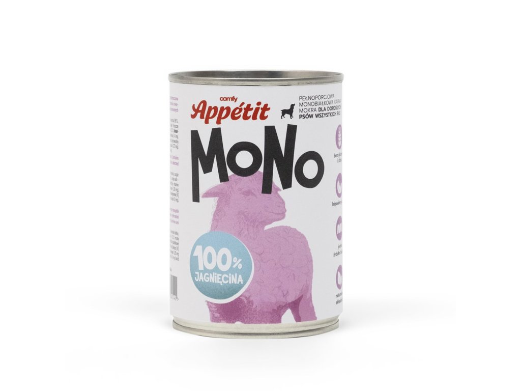 Comfy Appetit MONO je kompletné jednobielkovinové vlhké krmivo s jahňacím mäsom pre dospelé psy, vyrobené z prírodných surovín. Príchuť 100% jahňacie. Krmivo obsahuje 96 % mäsa a vnútorností, zvyšné 4 % sú vitamíny a minerálne prísady.