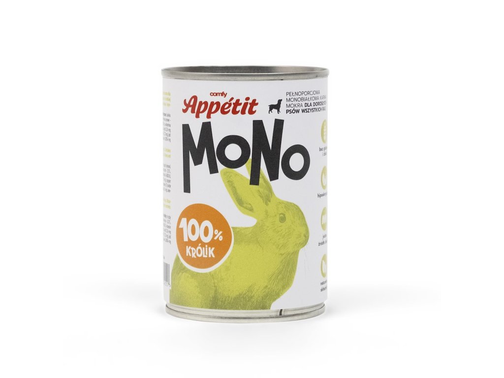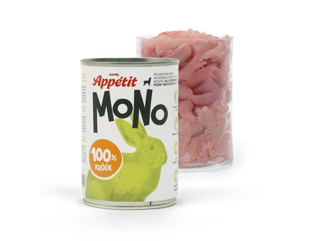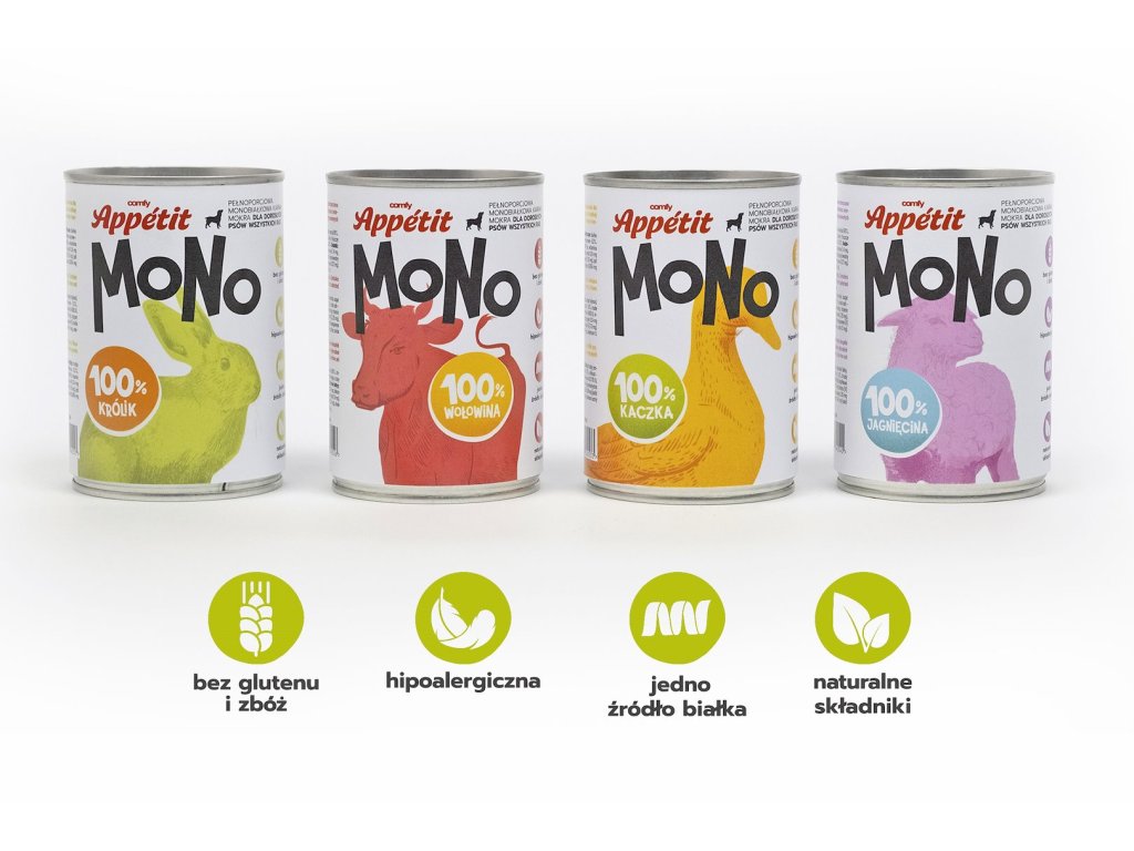 Comfy Appetit MONO je kompletné jednobielkovinové vlhké krmivo pre dospelé psy, ktorého zloženie obsahuje prírodné zložky. Výrobok obsahuje 96 % mäsa a živočíšnych zložiek. Je k dispozícii v niekoľkých príchutiach: