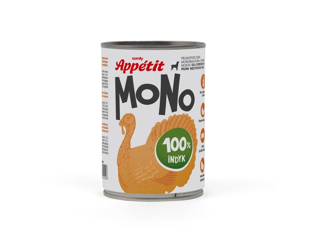 Comfy Appetit MONO je kompletné jednobielkovinové vlhké krmivo pre dospelé psy vyrobené z prírodných surovín. Výrobok obsahuje 96 % mäsa a vnútorností. Je k dispozícii v niekoľkých príchutiach: