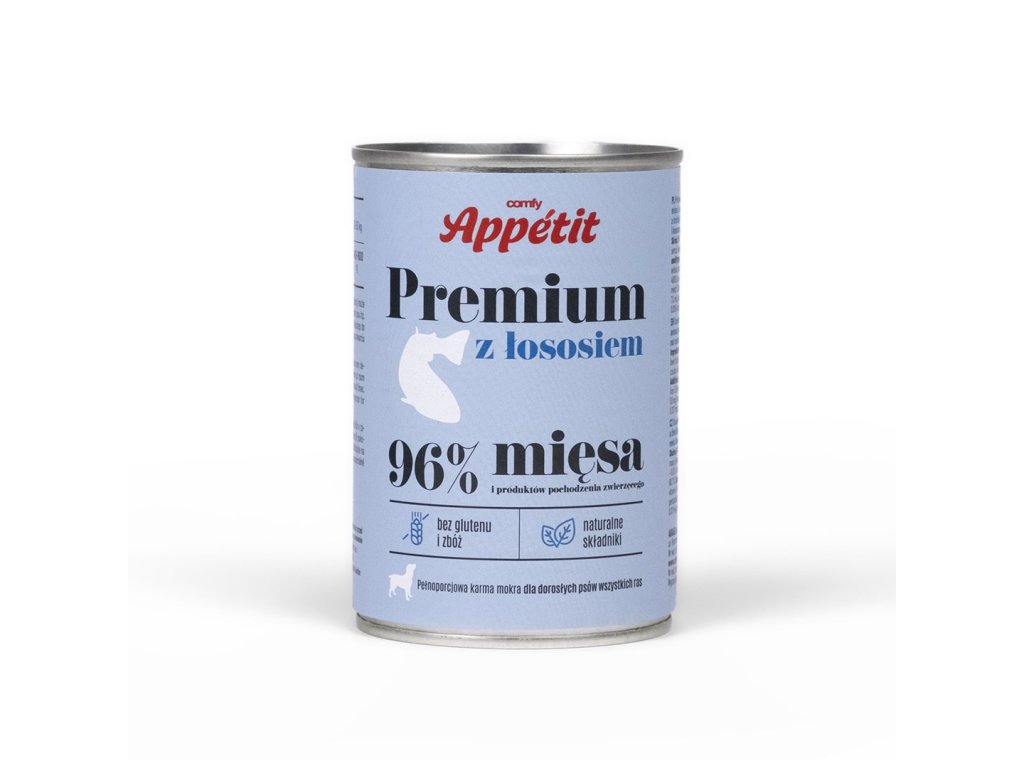Comfy Appetit Premium je kompletné vlhké krmivo s lososom pre dospelé psy, vyrobené z prírodných surovín. Krmivo obsahuje 96 % mäsa, rýb a vnútorností a je obohatené o vitamíny a minerály. Vybraná zmes troch zdrojov bielkovín dodáva krmivu výnimočnú chutnosť.