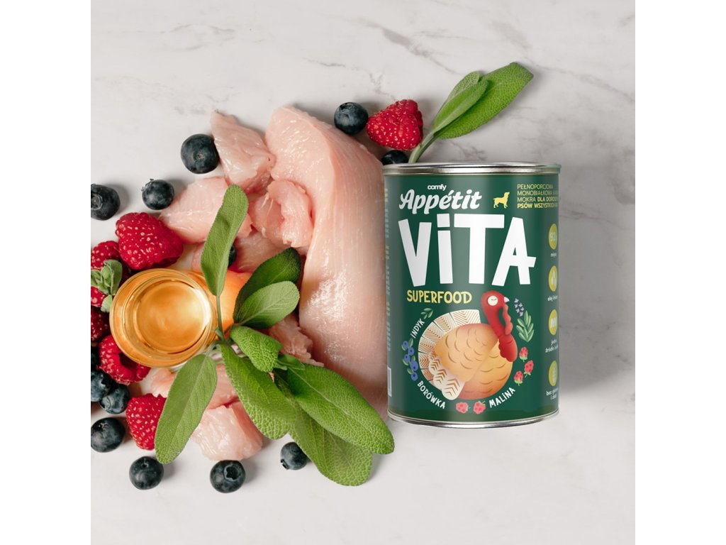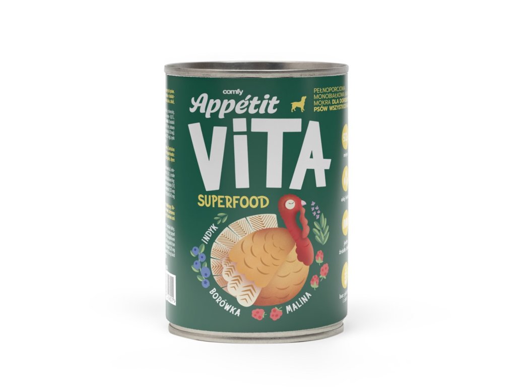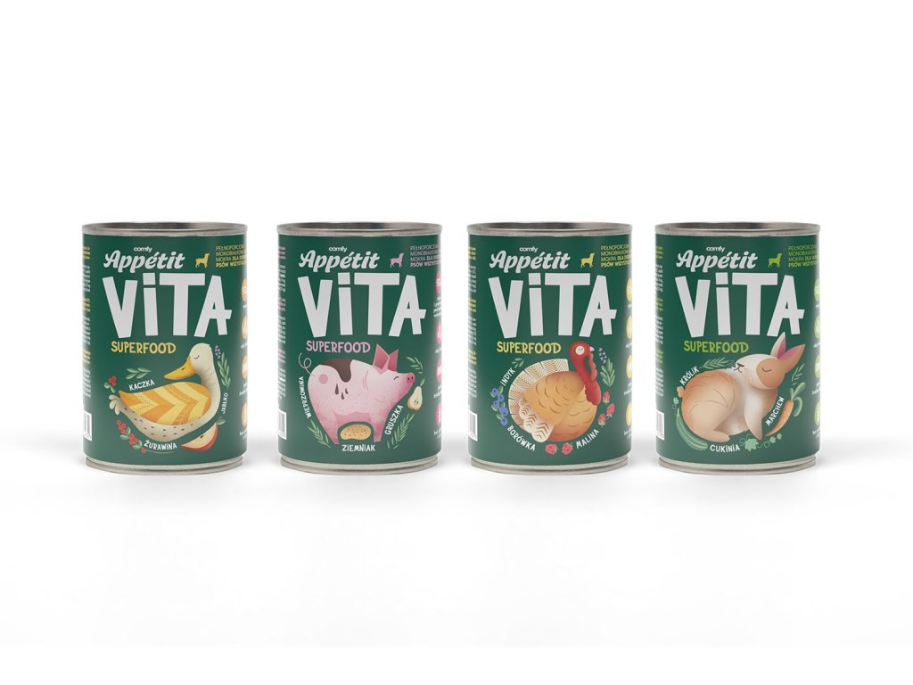 COMFY APPETIT VITA SUPERFOOD - monoproteínové vlhké krmivo pre všetky plemená psov so superpotravinami