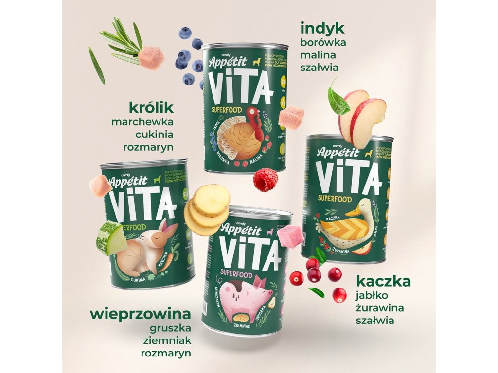 Prídavok malín, čučoriedok, mrkvy a jablka predstavuje bohatstvo cenných živín. Šalvia a rozmarín dodávajú jedinečnú vôňu a povzbudzujú chuť do jedla. S mokrým krmivom Comfy Appetit Vita si váš pes vychutná nielen chutné, ale aj plnohodnotné jedlo s mnohými zdravotnými benefitmi!