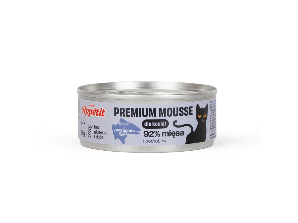 Comfy Appetit Premium Mousse pre mačiatka obsahuje 92 % mäsa a vnútorností (vrátane 26 % pstruha), zvyšok tvoria vitamíny, minerály a prebiotiká FOS/MOS.