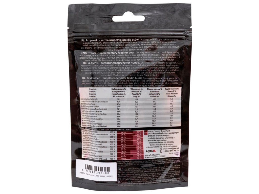 Prírodné mäsové prúžky poľskej výroby, ideálne ako občerstvenie pre psa alebo odmena počas prechádzky alebo výcviku. Dajú sa ľahko rozdeliť na menšie kúsky,...
