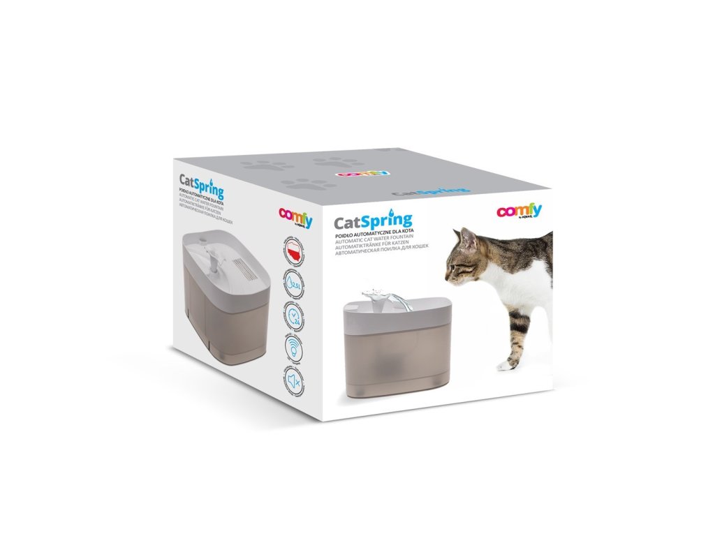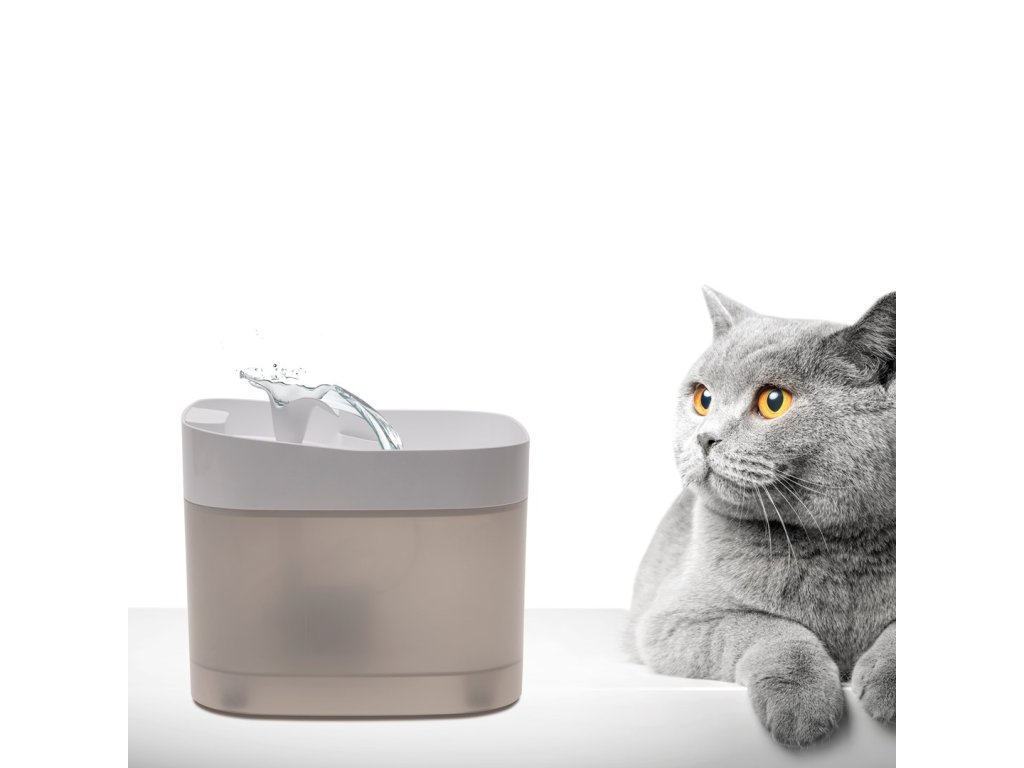 Fontána pre mačky s tichým, úsporným čerpadlom, ktoré sa vypne pri nízkej hladine vody. Trojitý filter čistí vodu, kompaktný dizajn a ochrana proti pretečeniu.