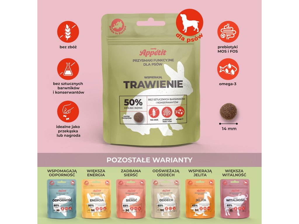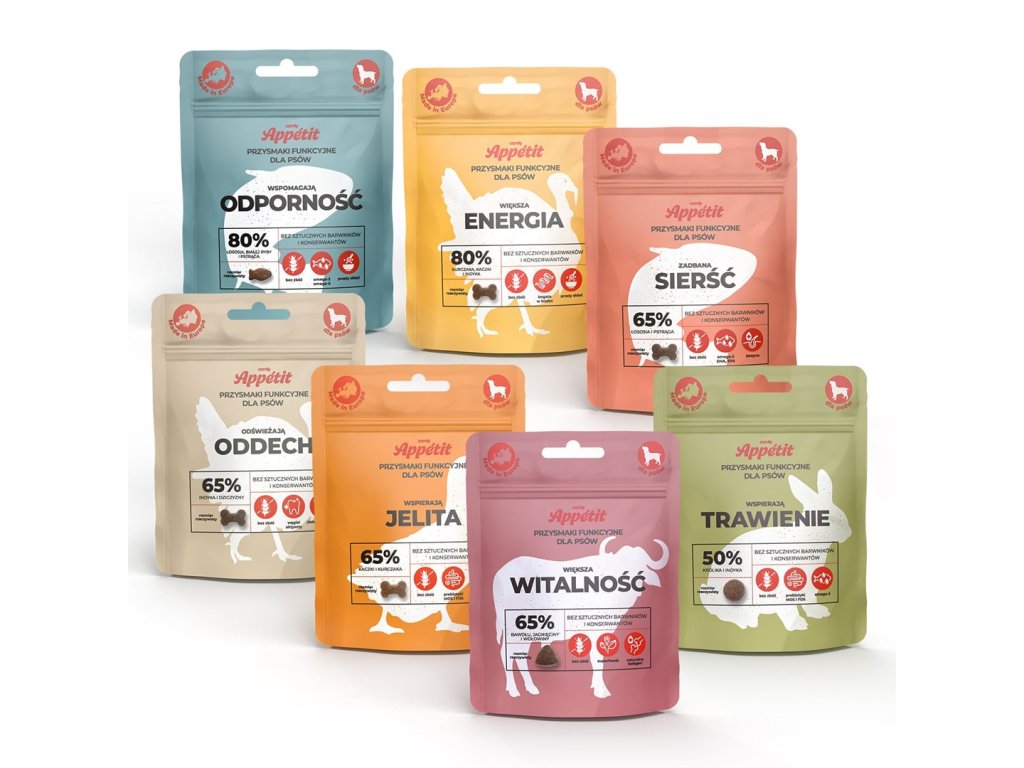 Objavte jedinečný rad funkčných pochúťok pre psovbez obilnín - navrhnutý pre zdravie, energiu a potešenie vášho domáceho maznáčika. Každý variant sú chrumkavé granule v praktických tvaroch, plné starostlivo vybraných zložiek, bez umelých farbív a konzervačných látok. Vysoký obsah čerstvého mäsa alebo rýb a funkčných prísad podporuje špecifické oblasti zdravia - od imunity až po lesklú srsť. Pamlsky sú ideálne ako odmena počas výcviku alebo ako občerstvenie na jedno zahryznutie. Vyrobené v Európe.