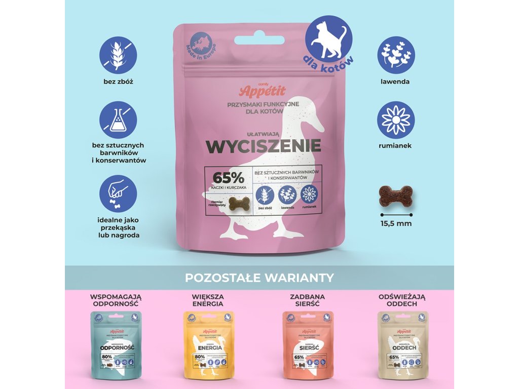 Comfy Appetit Functional Treats bez obilnín je rad vytvorený s ohľadom na zdravie, energiu a každodenný komfort vašej mačky. Každý variant sú chrumkavé granule plné starostlivo vybraných zložiek, ktoré podporujú rôzne oblasti zdravia - od imunity až po lesklú srsť. Všetky sú bohaté na čerstvé mäso alebo ryby a neobsahujú obilniny, umelé farbivá ani konzervačné látky. Ideálne ako odmena, súčasť hry alebo jednohubka. Vyrobené v Európe.