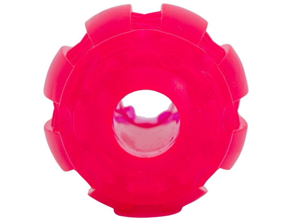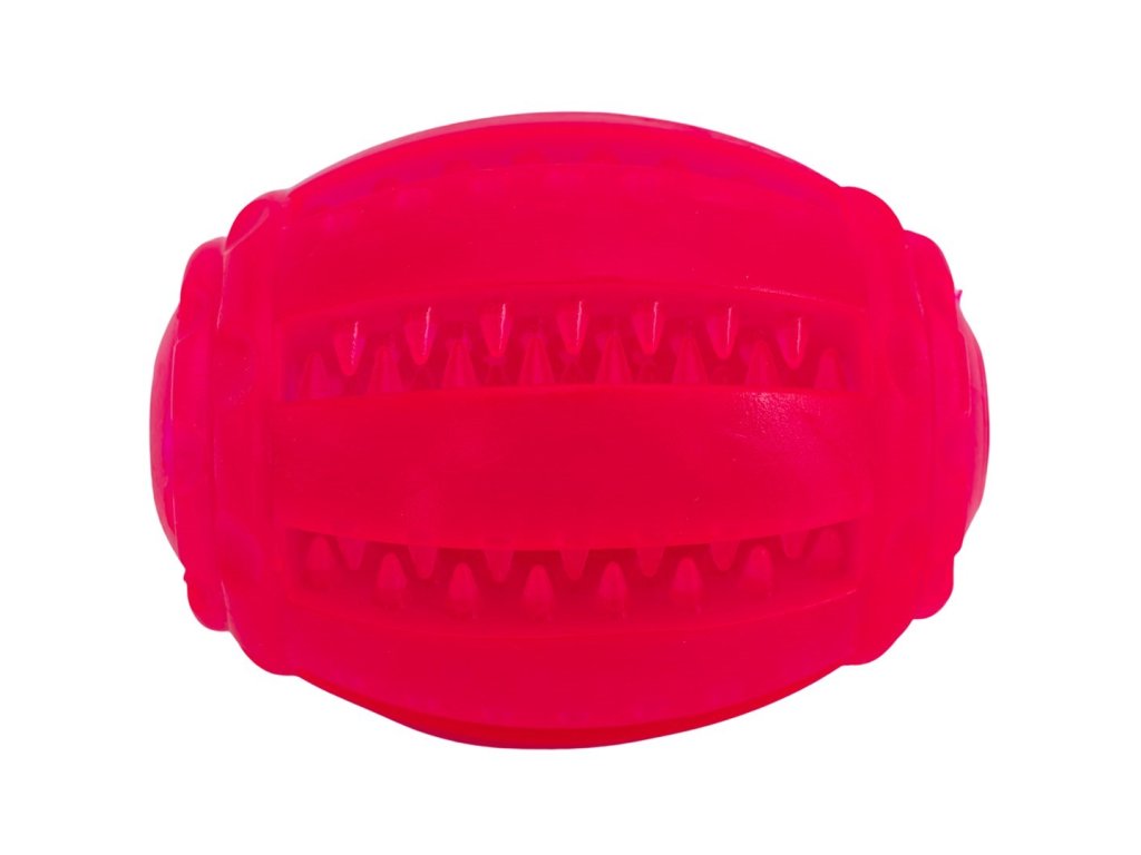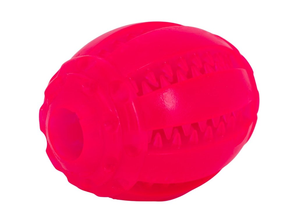 Hračka má jedinečný dizajn v tvare vajíčka, vďaka ktorému loptička nepravidelne skáče, čo zaručuje skvelú zábavu. Hračka je vyrobená z gumy, ktorá je pružná, príjemná na dotyk a určite príjemná na hryzenie. Po stranách loptičky sa nachádzajú výstupky na masírovanie zubov, medzi ktoré môžete zastrčiť aj hryzátka. Po celej dĺžke loptičky je otvor, cez ktorý môžete prevliecť rúno a urobiť ťahadlo. Vďaka žiarivo ružovej farbe dizajnu ju navyše ľahko nájdete. Ďalšou výhodou loptičky je jej príjemná mätová vôňa, vďaka ktorej váš psík loptičku lepšie vystopuje.