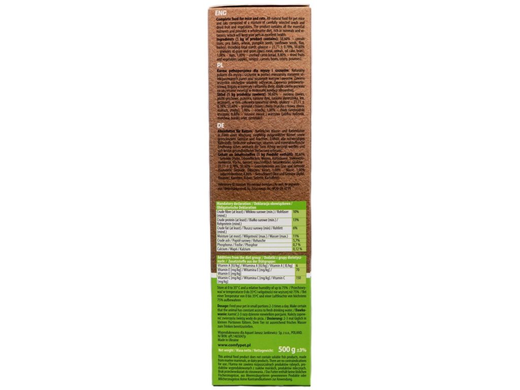 Doplnkové krmivo pre králiky a hlodavce. Zloženie: 45% kukuričná múka, 45% ryžová múka, 10% žltá paprika. Analytické zložky: N-látky 7,5%, oleje a tuky...