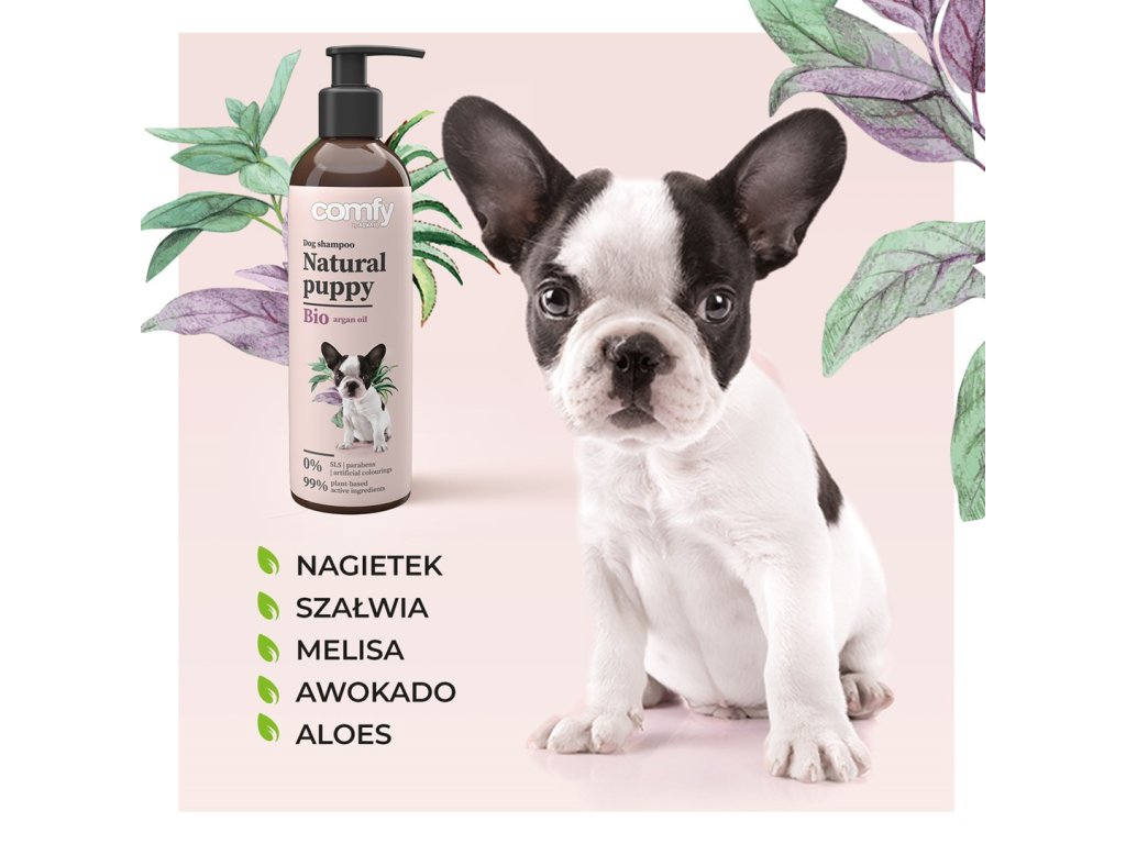 Natural Puppy je výnimočne jemný šampón pre šteňatá. Obsahuje výťažky z nechtíka, šalvie, medovky, avokáda a aloe vera, ktoré sa starajú o jemnú srsť a citlivú pokožku. Vďaka protizápalovým a upokojujúcim vlastnostiam je ideálny pre šteňatá so sklonom k podráždeniu. BIO arganový olej vyživuje srsť a svieža vôňa aloe vera spríjemňuje a uvoľňuje kúpanie.
