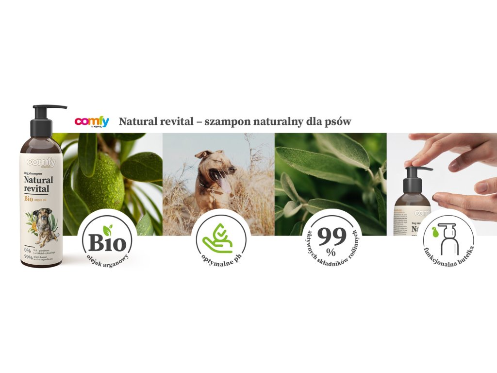 Natural Revital je šampón určený pre psy s veľmi citlivou pokožkou. Obsahuje výťažky z aloe vera, pupalky dvojročnej, žihľavy, ľanu a nechtíka lekárskeho, ktoré výrazne regenerujú, posilňujú a hydratujú srsť. Upokojuje podráždenie, upokojuje a podporuje hojivé procesy. Certifikovaný BIO arganový olej vyživuje a dodáva zdravý lesk. Svieža vôňa aloe vera dodáva kúpeľu prirodzenú ľahkosť.