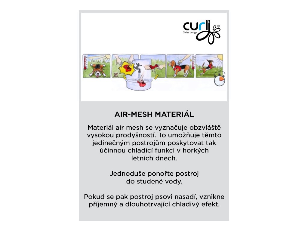 - Chladiaci účinok pri ponorení do vody – vzdušný materiál postroja sa vyznačuje mimoriadne vysokou priepustnosťou vzduchu a tak umožňuje poskytovať účinný chladiacu funkciu počas horúcich letných dní. Postroj jednoducho ponorte do studenej vody. Ak ho následne nasadíte svojmu psíkovi, vytvorí sa tak príjemný a dlhotrvajúci chladivý efekt.