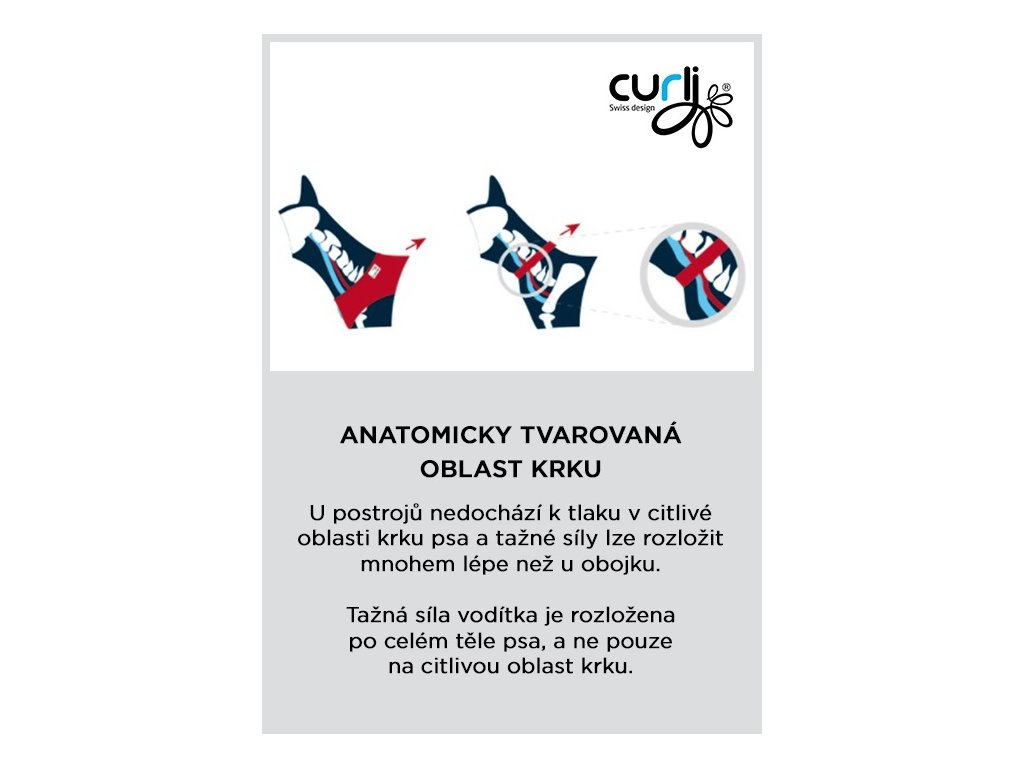 - Anatomicky tvarovaná oblasť krku – nedochádza tak k tlaku na citlivú oblasť krku psa a tlaková sila vodítka sa tak rozloží na celé telo psa.