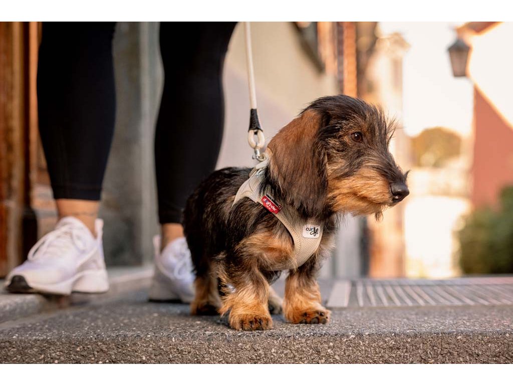Postroj je vyrobený z ľahkého vzdušného materiálu Air-Mesh pre pohodlné nosenie. Možnosť nastavenia veľkosti postroja pomocou suchého zipsu. Postroj je vyrobený tak, aby došlo k optimálnemu rozloženiu napätia a aby nedochádzalo k poraneniu krku. Polstrovaná pracka zabezpečuje, aby sa srsť nezachytávala ani nedráždila.