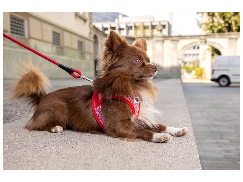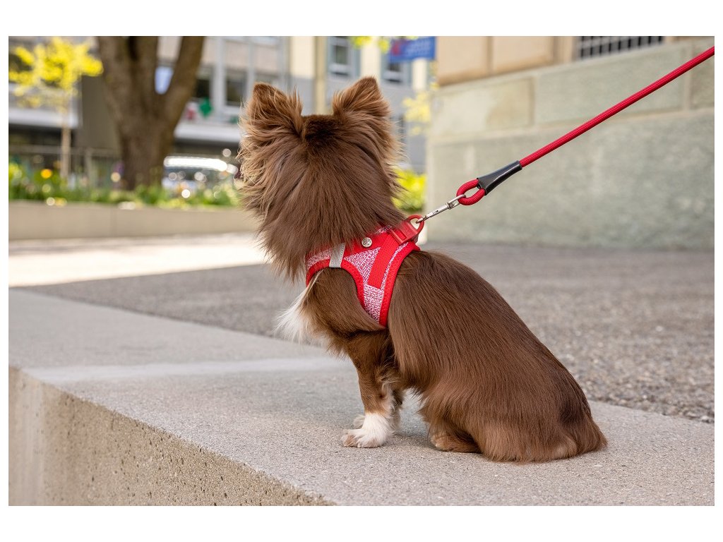 Vodítko a postroj je možné pripnúť jednou rukou pomocou spony. Vysoko pevný materiál spony vydrží ťahové zaťaženie...
