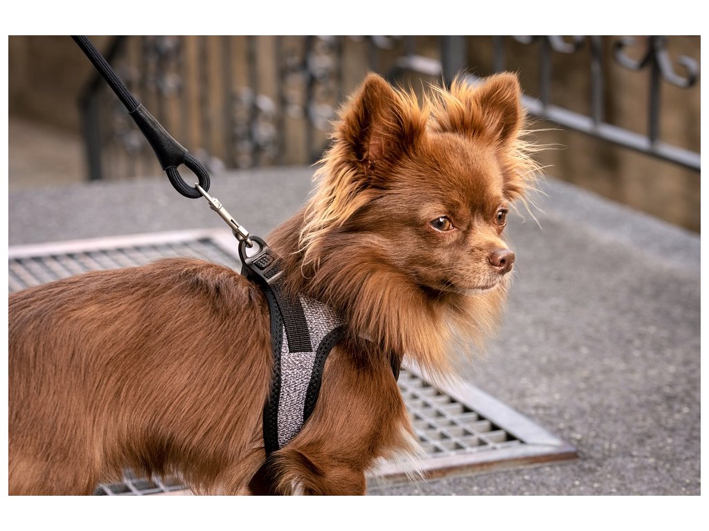 - Postroj vylepšený o praktickú sponu, vďaka ktorej sa vodítko a postroj dajú pripnúť jednou rukou