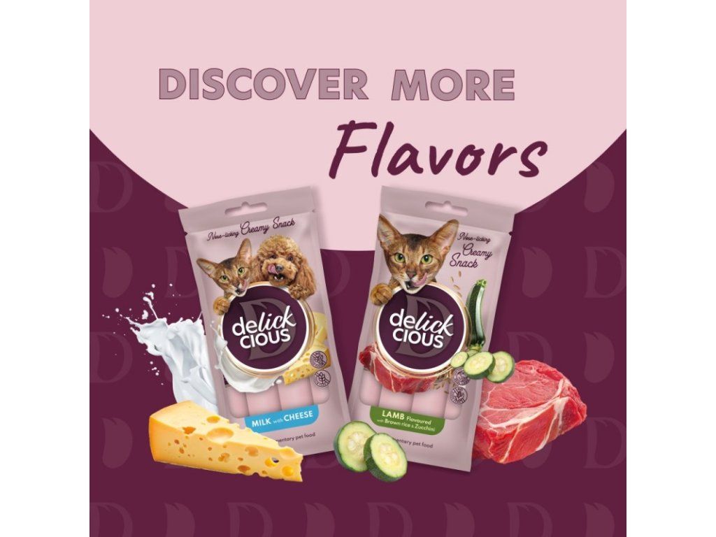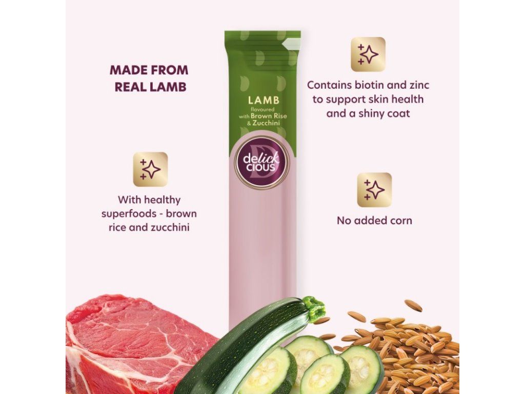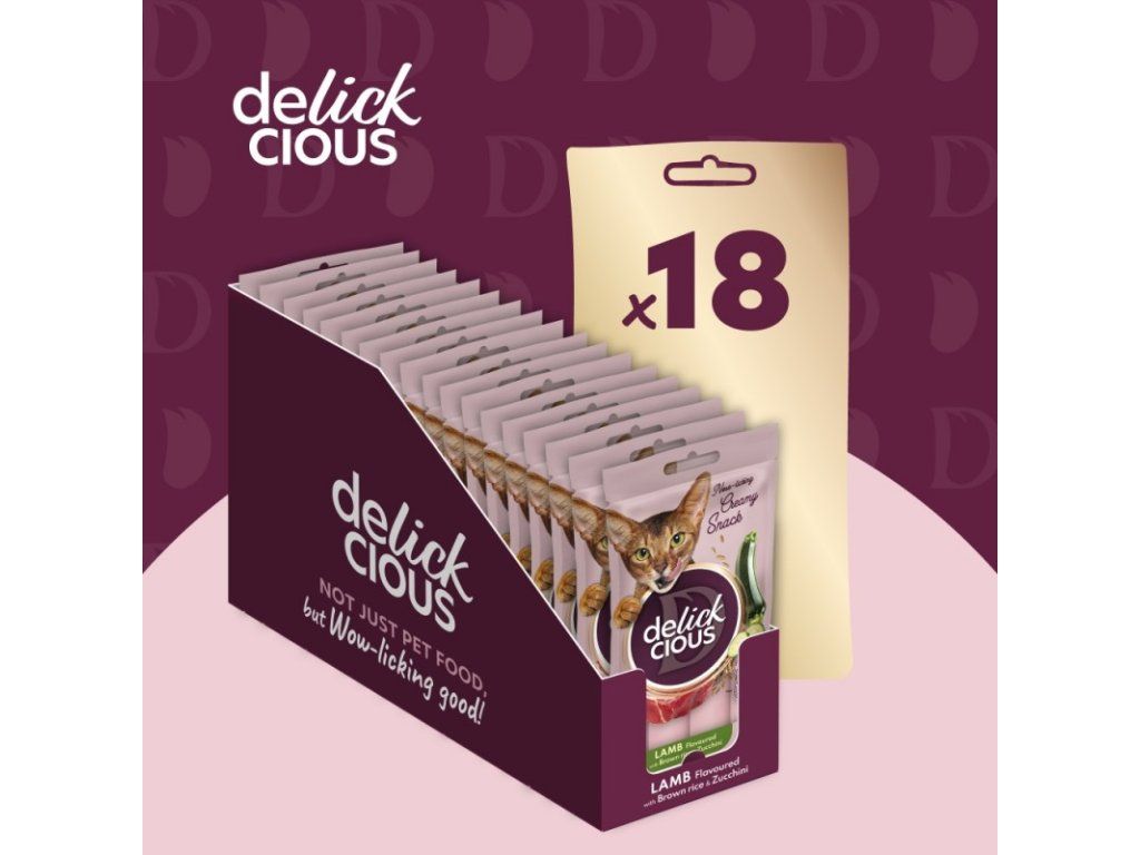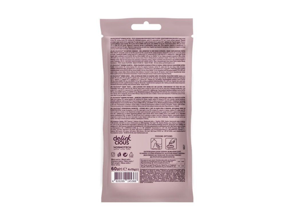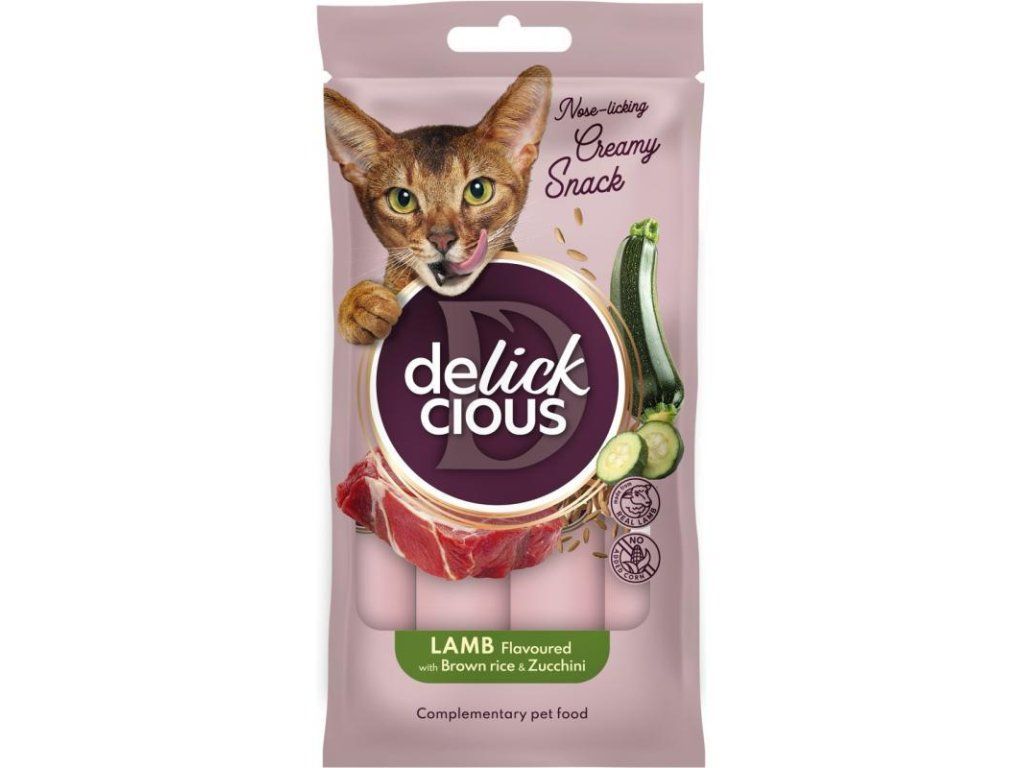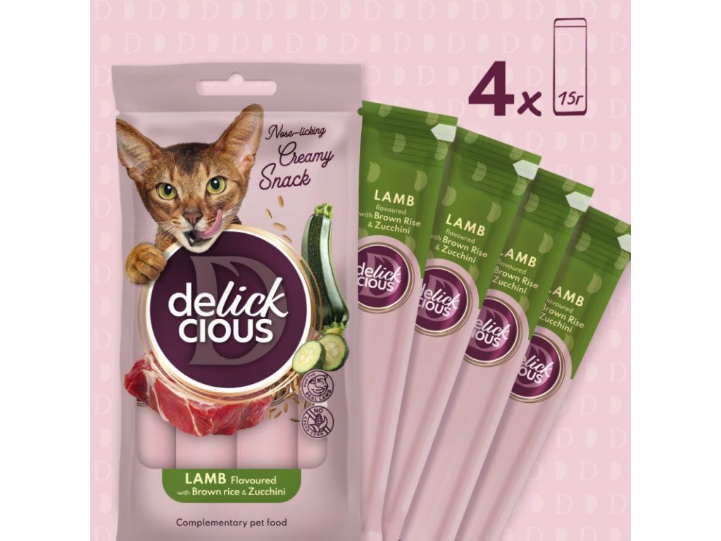 DELICKCIOUS™ krémové maškrty – jahňacie s hnedou ryžou a cuketou. Pre mačky 4 x 15 (5368)