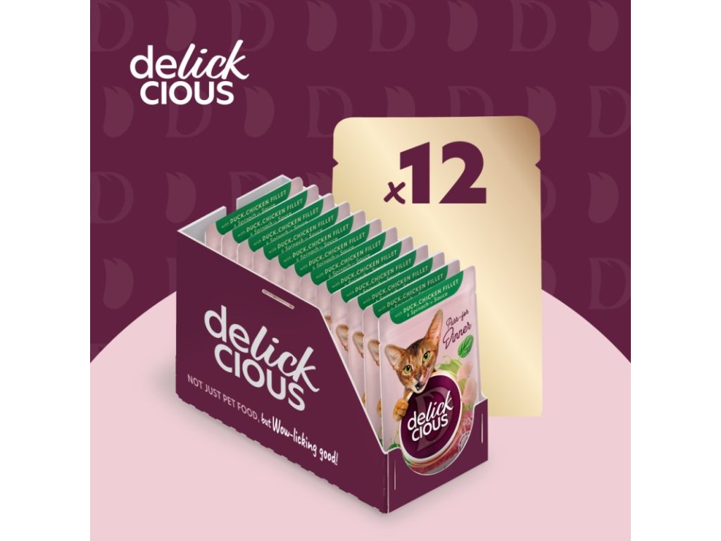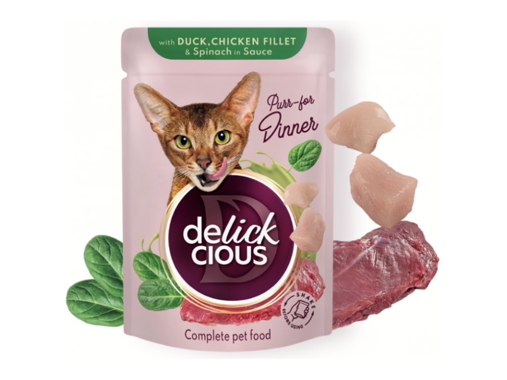 DELICKCIOUS s kačacou, kuracím filé a špenátom v omáčke. Kompletné krmivo pre dospelé mačky.