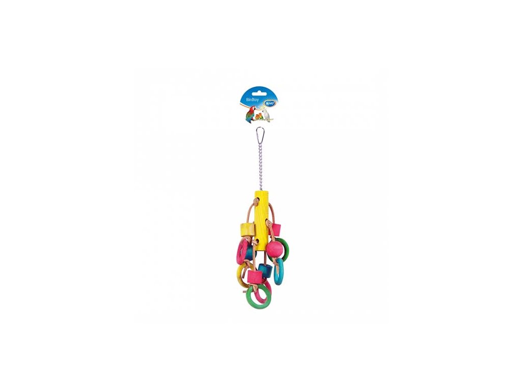 Závesná hračka pre vtáky. Vyrobené z topoľového dreva, balvneného lana a železa. Obsahuje potravinárske farbivá. Veľkosť: 54 cm