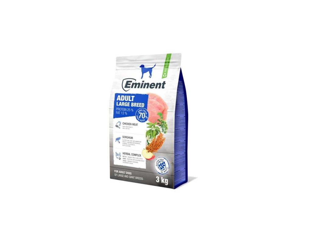 Kompletné bezlepkové krmivo Eminent Adult Large Breed je špeciálne vyvinuté pre dospelých psov veľkých a obrích plemien. Obsahuje minimálne 70 % živočíšnych bielkovína je doplnené optimálnym pomerom bielkovín, tukov, minerálova prídavkom chondroitínu a glukozamínu pre zdravé kĺby. Veľkosť a tvar granúl sú prispôsobené veľkým plemenám a pomáhajú predchádzať prehĺtaniu potravy a následným problémom s tým spojeným. Vhodné aj pre psy s citlivým trávením.