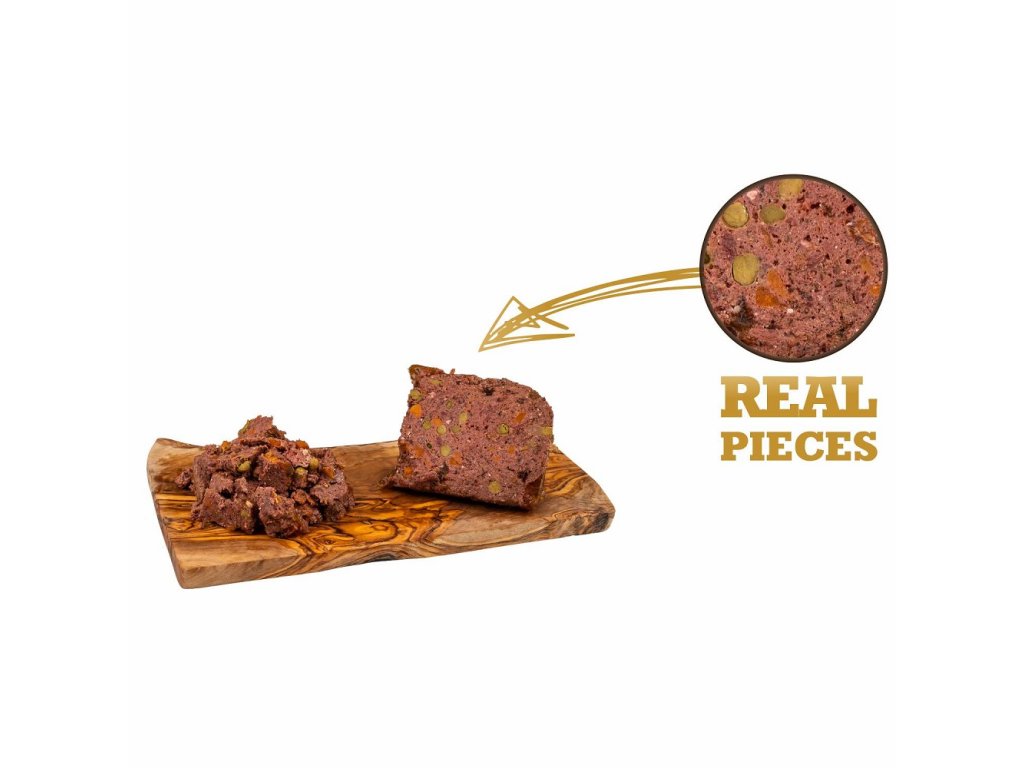 Zloženie: zverina, králik a vedľajšie produkty zo zveriny a králika, sladké zemiaky 5%, mrkva 3%, hrášok 2%, minerálne látky 1%, slnečnicový olej 0,2%