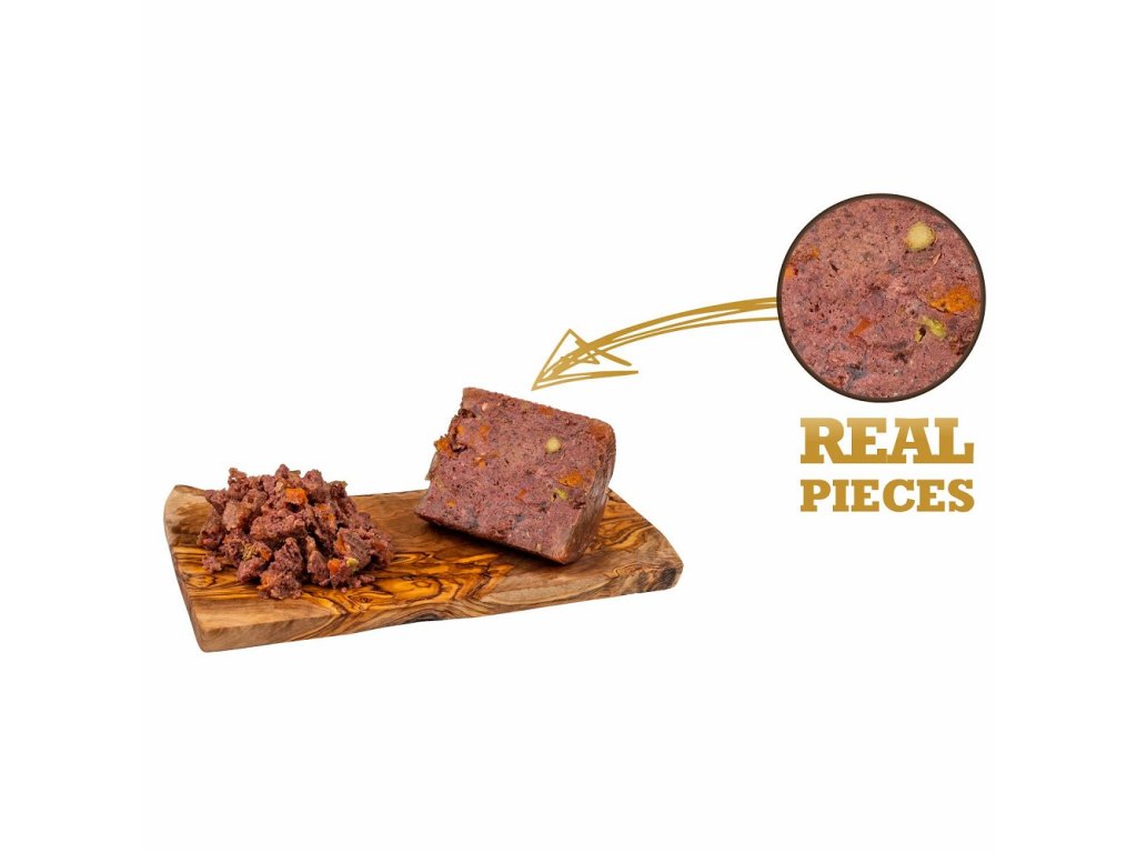 Zloženie: konina a vedľajšie produkty z koňa, mrkva 5%, hrášok 4%, minerálne látky 1%, slnečnicový olej 0,2%