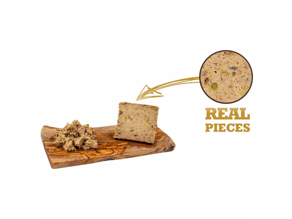 Zloženie: ryby a vedľajšie produkty z rýb 32% losos + 30% sleď, hrášok 5%, brusnice 3%, minerálne látky, oleje a tuky (lososový olej 0,2%)