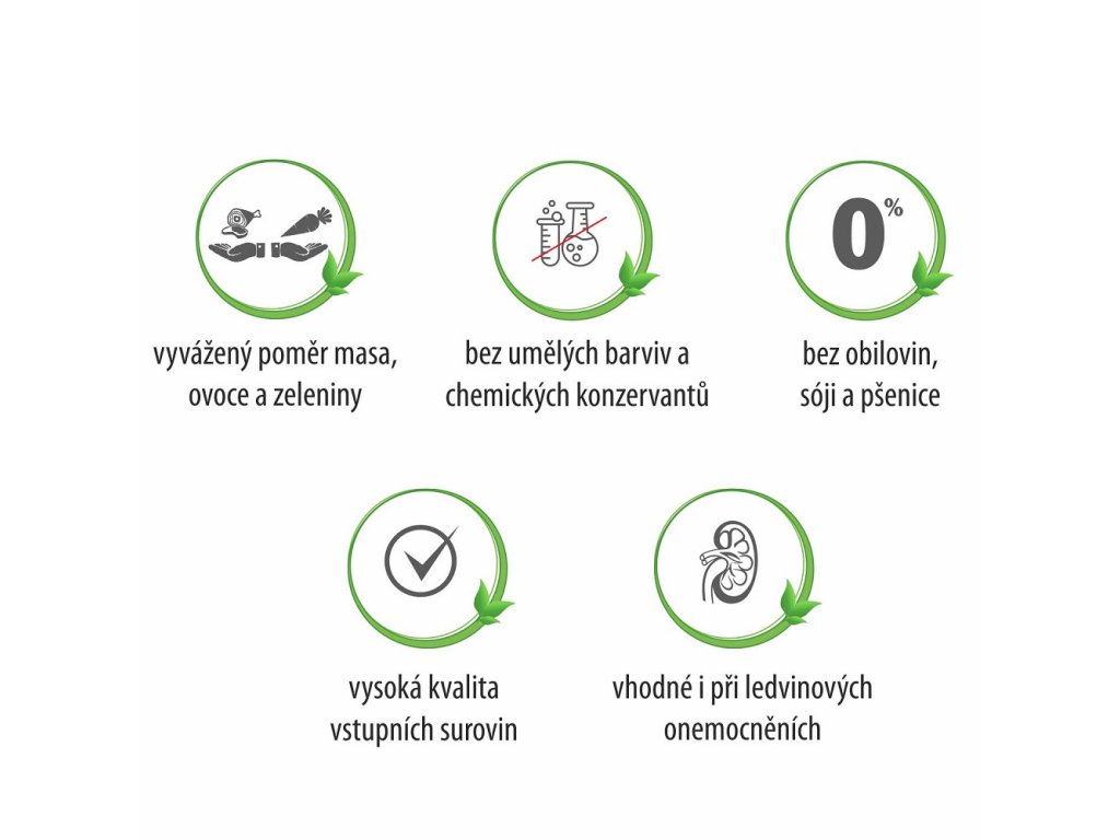Zloženie: morka a vedľajšie produkty z morky, mrkva 5%, hrášok 4%, minerálne látky 1%, slnečnicový olej 0,2%