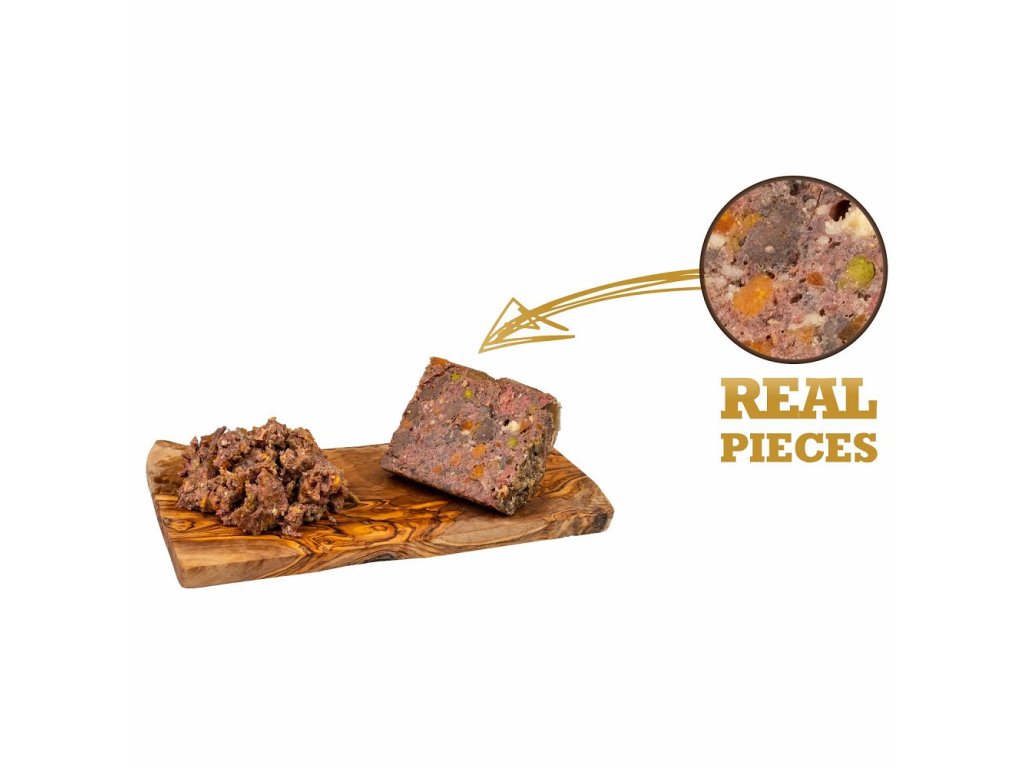 Zloženie: teľacie a vedľajšie produkty z teľacieho, sladké zemiaky 5%, mrkva 3%, hrášok 2%, minerálne látky 1%, slnečnicový olej 0,2%