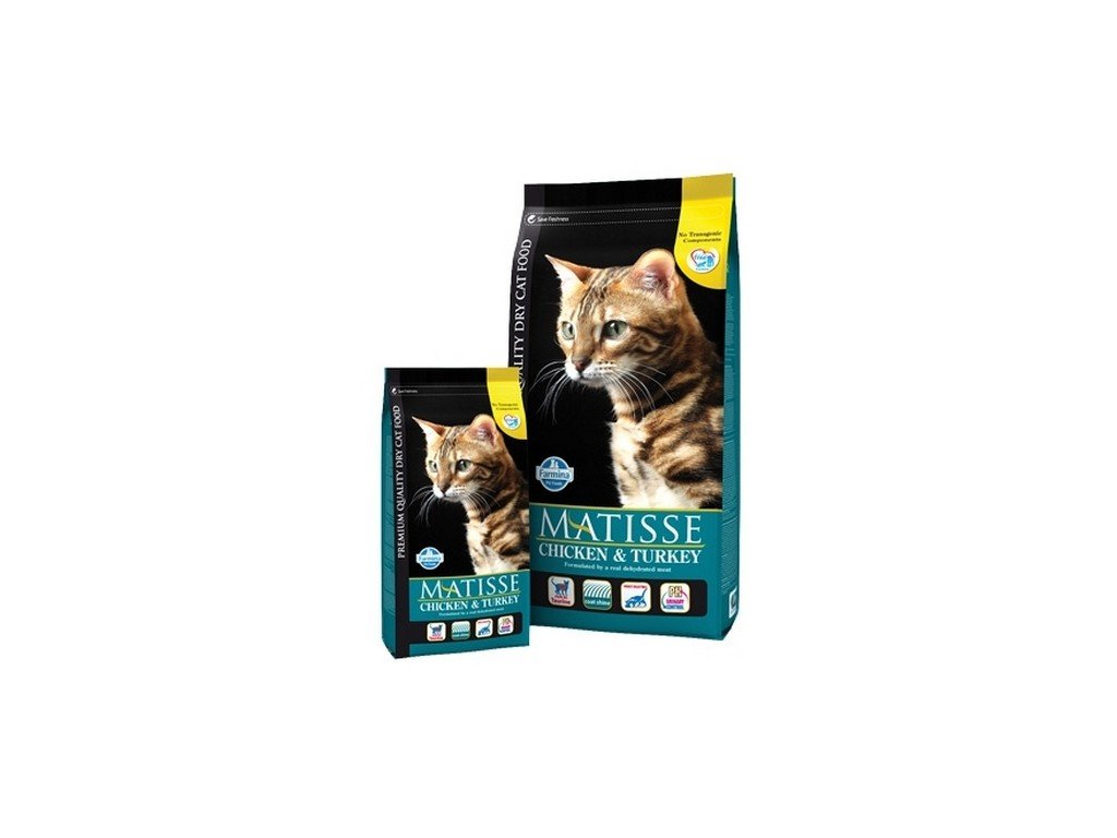 Matisse Chicken & Turkey and Vegetables je kompletné a vyvážené krmivo pre dospelé mačky s normálnou fyzickou aktivitou. Obsahuje najlepšie ingrediencie pre zdravú a vyváženú stravu. Kura, morka, ryža a zelenina zaručujú vhodný kalorický a proteínový príjem ako aj vysokú stráviteľnosť. Podporuje chuť do jedla, obsahuje správne množstvo taurínu, esenciálneho proteínu, vyvážené množstvo omega 3 a 6 nenasýtených mastných kyselín, všetky vitamíny a minerálne látky potrebné pre správnu a vyváženú stravu. Matisse Chicken & Turkey and Vegetables neobsahuje geneticky modifikované zložky.