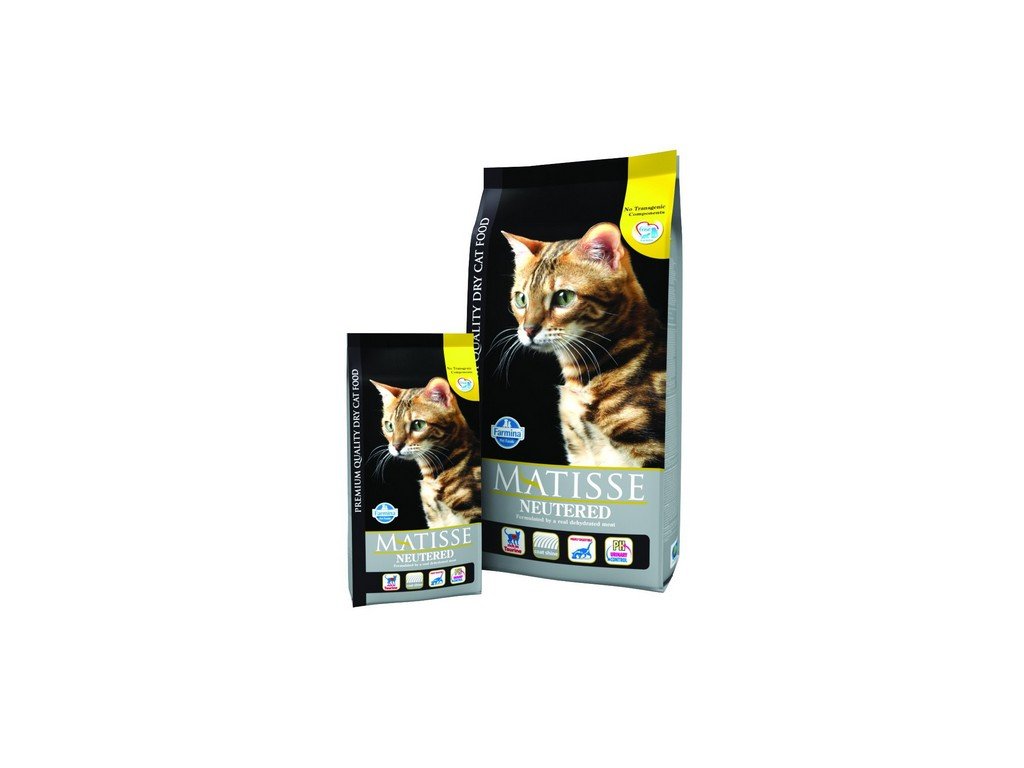 Matisse Neutered je kompletné krmivo pre dospelé, vykastrované mačky. Vďaka svojmu zloženiu zabráni priberaniu a pomáha predísť diabetesu. Krmivo je bohaté na vlákninu, čo zaručuje správnu funkciu tráviaceho traktu.Zloženie:Dehydrované kuracie mäso (min. 32 %), ryža (min. 25 %), kukurica, kukuričný gluteín, vláknina (vláknina z hrášku, celulóza v prášku), dehydrovaná ryba, kurací tuk, digest, sušená repná drť, rybí olej, rastlinný olej, chlorid sodný, metionín, sušené pivovarské kvasnice, taurín, minerálne látky, vitamíny. Analýza:vlhkosť 9%, proteíny 31%, oleje a tuky 11%, vláknina 5,9%, popol 6,6%, vápnik 0,9%, fosfor 0,8%, horčík 0,08%, taurín 0,18.