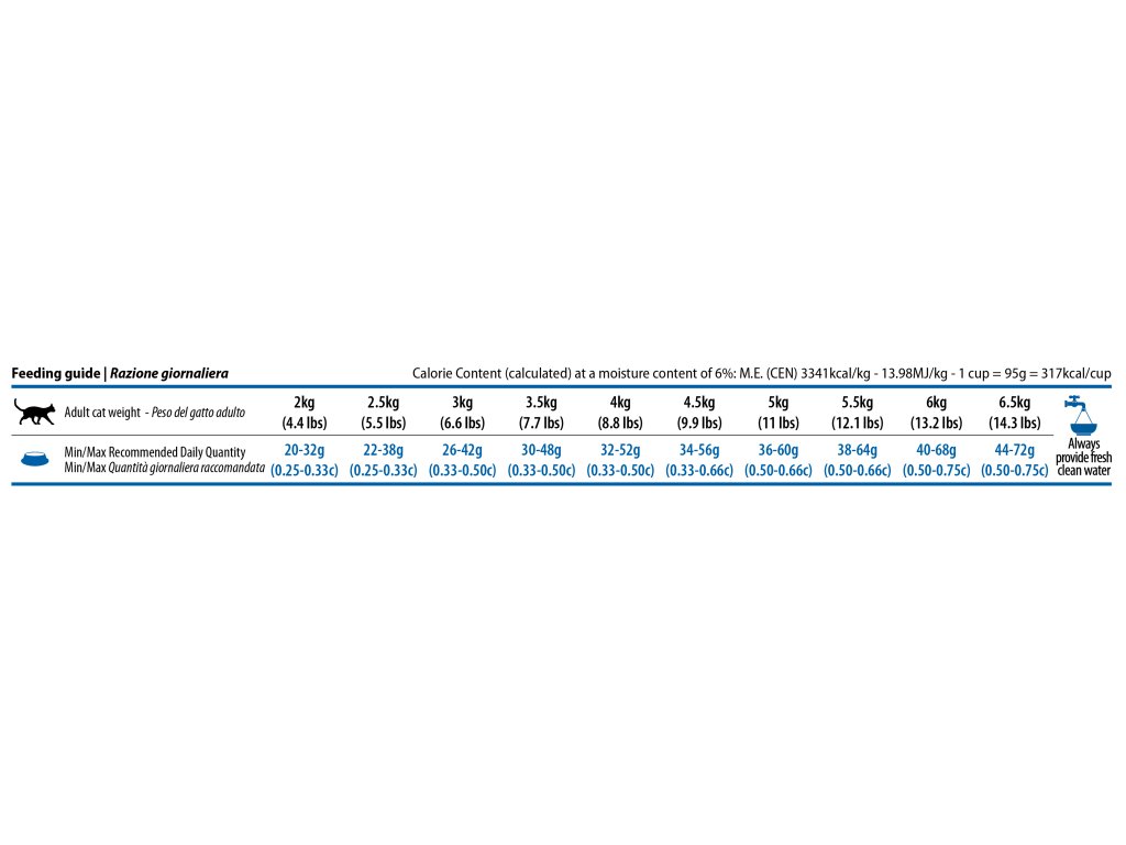 Adult cat weight (kg) | Adult cat weight (lbs) | Recommended Daily Quantity (g) | Recommended Daily Quantity (cups) |