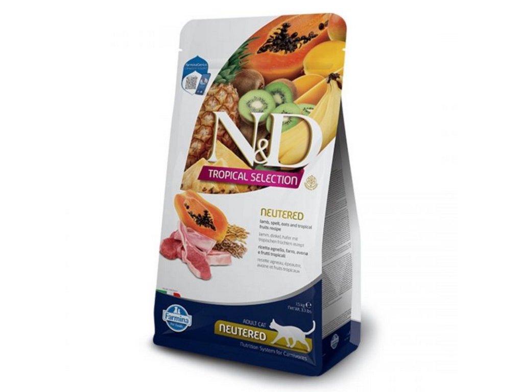 Farmina N&D cat Tropical selection (AG) adult neutered lamb je výživná strava pre dospelé kastrované mačky, ktorá sa vyznačuje skvelým zložením z prírodných surovín. Hlavnou zložkou tohto krmiva je kvalitná jahňacina, ktorá poskytuje bielkoviny pre silné svaly a životnú vitalitu.Výťažky z rôznych druhov ovocia ako banány, kiwi, mango, papája a ananás poskytujú prírodné vitamíny, minerály a antioxidanty.