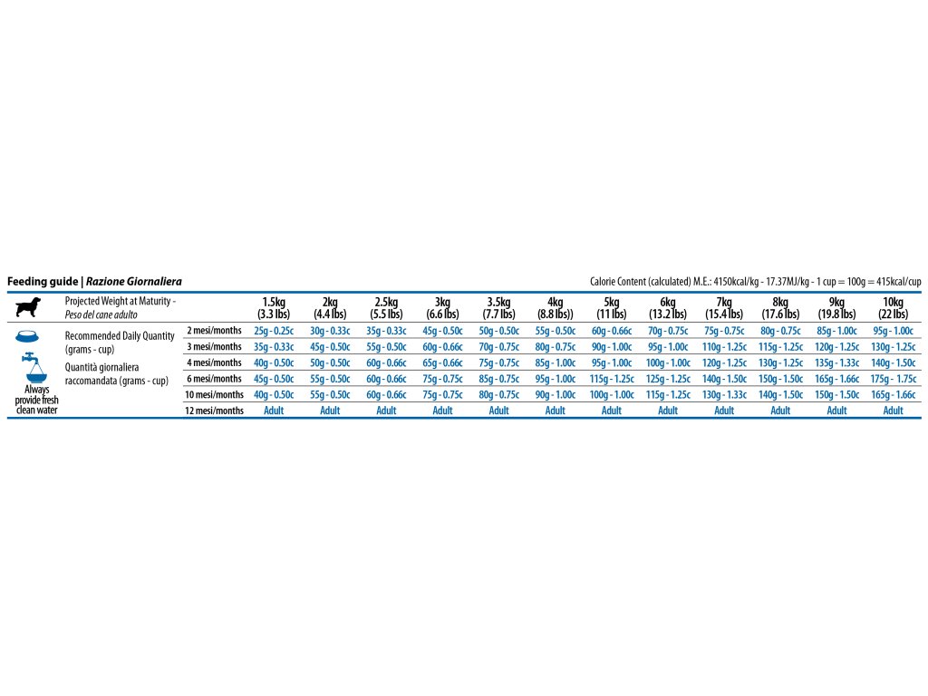 | 4 mesi/months | 40g - 0.50c | 50g - 0.50c | 60g - 0.66c | 65g - 0.66c | 75g - 0.75c | 85g - 1.00c | 95g - 1.00c | 100g - 1.00c | 120g - 1.25c | 130g - 1.25c | 135g - 1.33c | 140g - 1.50c |