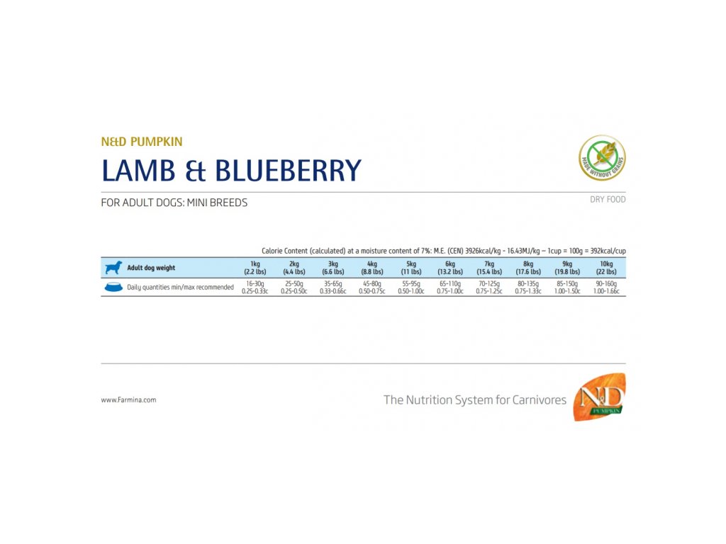 Farmina N&D dog PUMPKIN GF adult mini, lamb & blueberry je kompletné krmivo bez obilnín pre dospelých psov malých plemien s tekvicou, jahňacím mäsom a čučoriedkami.