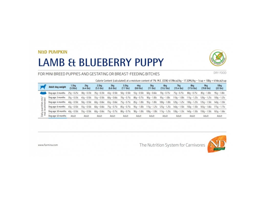 Farmina N&D dog PUMPKIN GF puppy mini, lamb & blueberry je kompletné krmivo bez obilnín pre šteňatá malých plemien, gravidné a laktujúce suky s tekvicou, jahňacím mäsom a čučoriedkami.