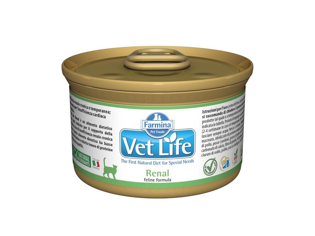 Farmina Vet Life Renal je kompletná veterinárna diéta pre mačky na podporu funkcie obličiek v prípadoch akútneho alebo chronického renálneho zlyhania. Toto krmivo obsahuje nízku hladinu fosforu a znížený obsah bielkovín s vysokou biologickou hodnotou. Omega-3 mastné kyseliny (EPA, DHA) znížujú riziko zhoršovania glomerulárnej fitrácie. Komplex antioxidantov (vitamíny E a C, taurín a luteín) posilňuje imunitu a tlmí účinky voľných radikálov.